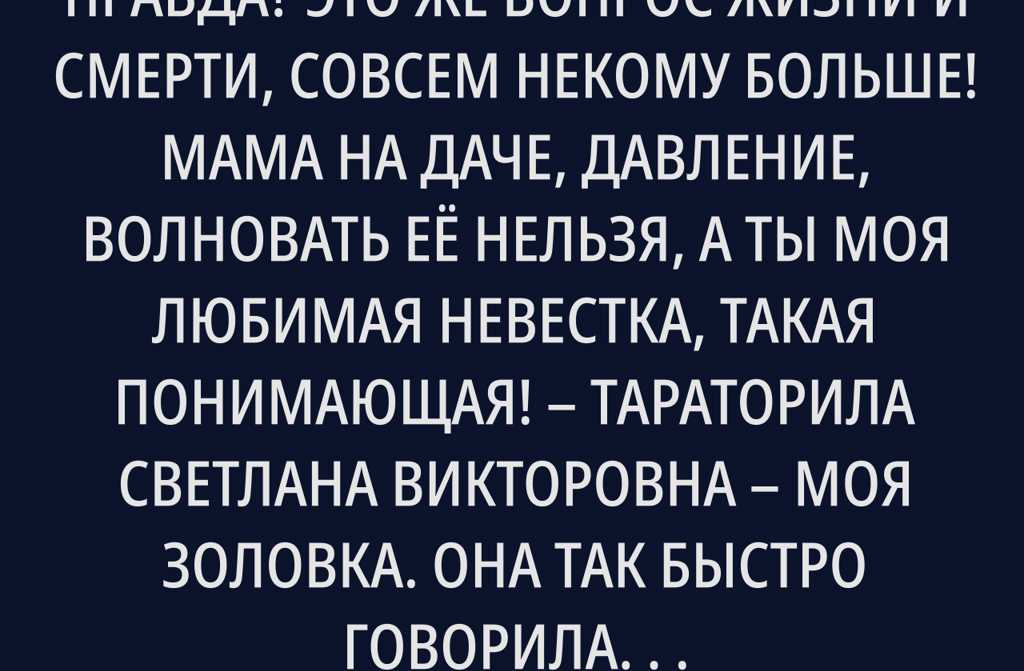 Ну, Алёночка, ты выручишь, правда? Это же вопрос жизни и смерти, совсем некому больше! Мама на даче, давление, волновать её нельзя, а ты моя любимая невестка, такая понимающая! тараторила Светлана Викторовна моя золовка. Она так быстро говорила, что я успевала понять лишь отдельные фразы: «срочно», «буквально на вечер», «выручай».